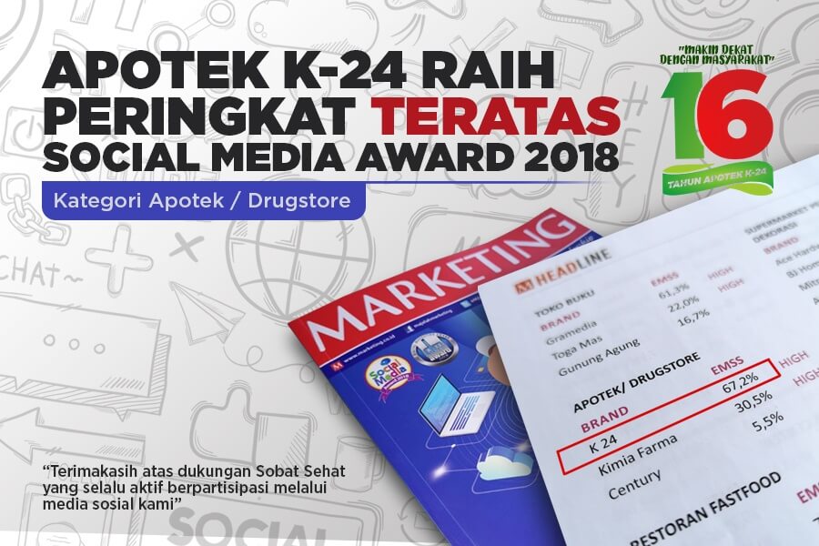 Dengan diraihnya Social Media Award 2018 ini, kehadiran Apotek K-24 di dunia online akan semakin mendapat perhatian masyarakat. Apotek K-24 Sobat sehat kita kita bagi masyarakat dan Netizen di seluruh Indonesia.