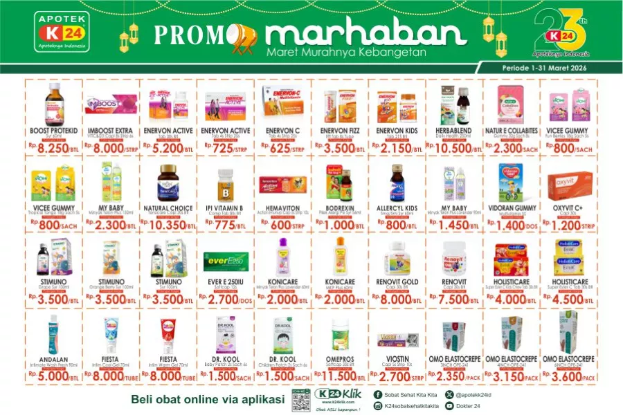 Memasuki bulan Maret 2026, suasana suci Ramadan mulai terasa. Nah, untuk merayakannya, Apotek K-24 kembali hadir dengan kejutan spesial yang bikin kantong tetap aman menjelang lebaran dengan Promo Marhaban (Maret Murahnya Kebangetan).